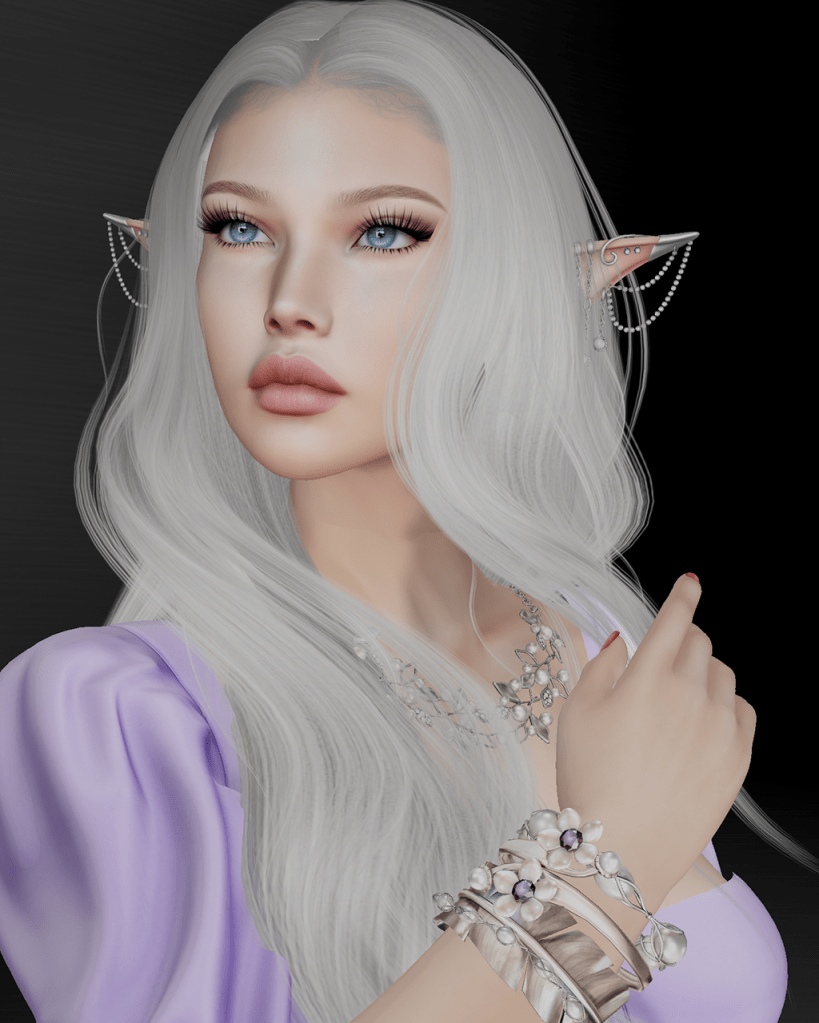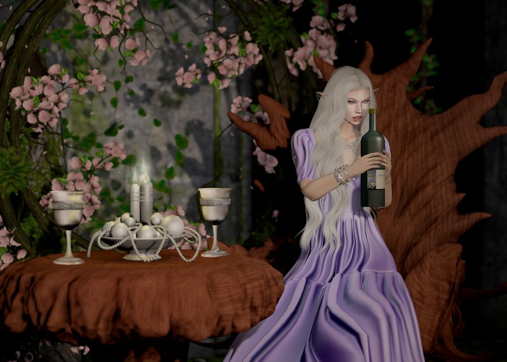 Tales aside, I’ve had a little sneak peak at the nifty goodies at the Faire as I’m an official blogger this year. This gorgeous gown is one of the RFL items from Belle Epoque. The table and throne are from Wythburn and they come with loads of texture options and tons of cool things you can rezz at the table (I’m using one of the candle sets in my pic). The branches and flowers at the background are actually a wearable halo from {Acios}, but I rezzed it to the ground as deco for the pic. There’s many different halos available, so I’ll probably wear one of them later again the way it should be worn, cause they’re quite neat. Lastly, my pretty sitting pose, which fitted perfectly to my scene, is from Pink Moon, although I edited the thumbs a bit to be around the bottle.