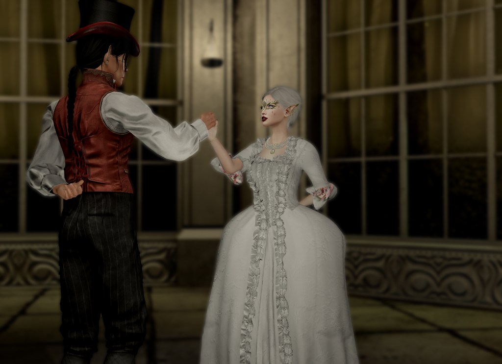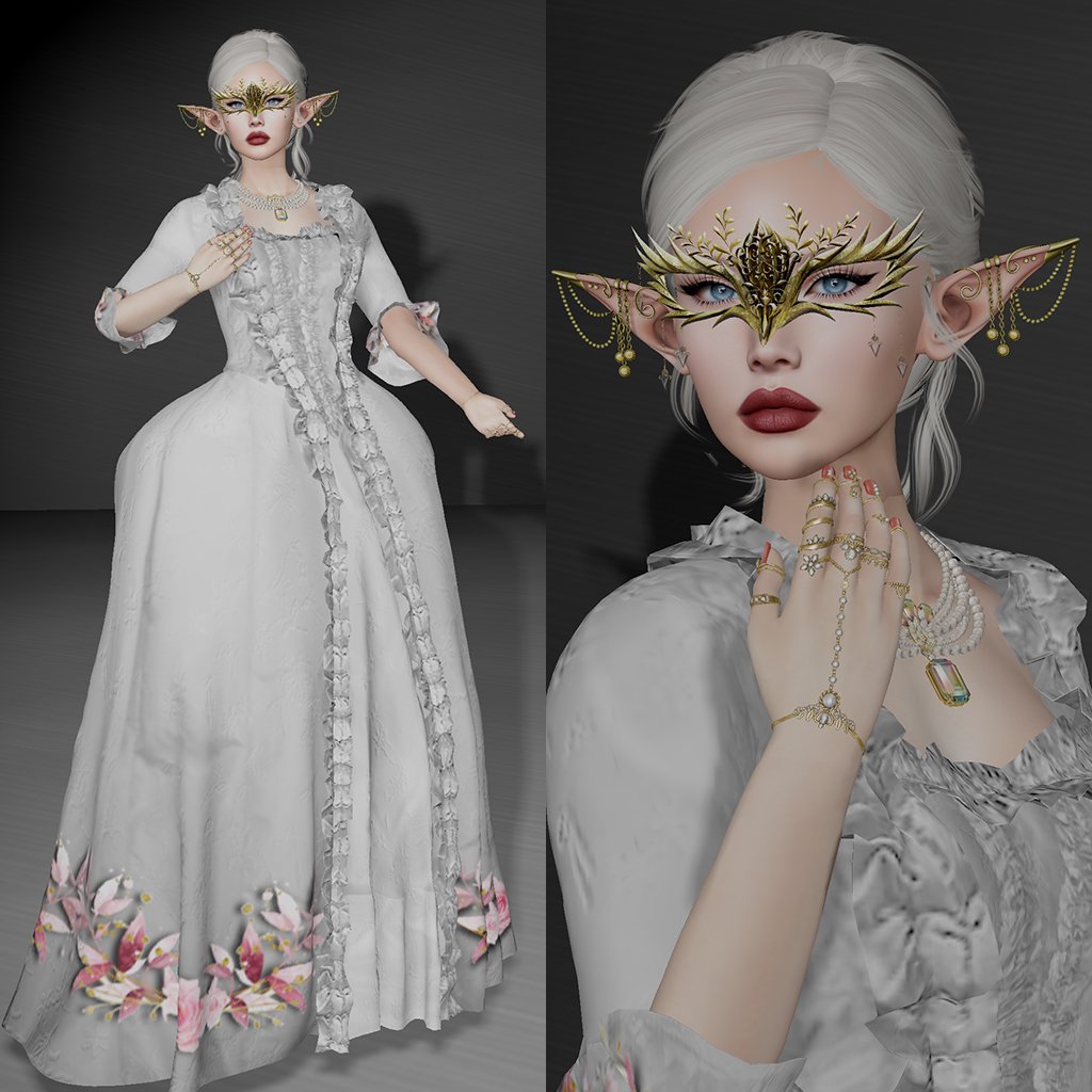 Yes, I have another sneak peak for you. I’m wearing this fabulous gown from Whymsical Marketplace. It comes also in other colours, if white’s not your thing. The beautiful golden mask is from Air and it’s also available in silver. The ball room itself is an Enchanted Woods skybox from Quills & Curiousities and it’s gorgeous. I edited the lights to be a bit dimmer for my picture (kudos for the creator for making it mod) and it worked perfectly to my pic. I’m sure I’ll be using this for pictures a lot in the future, too.