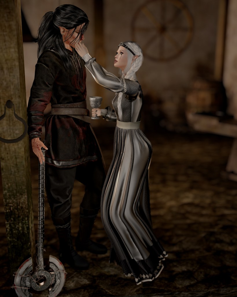 During our stroll, me and Ilyan visited the chilly, snowy land of Scrimshaw Warrens. After checking out the shops, I wanted to explore the landscape, and we stumbled upon a private moment between a mighty viking warrior and his wife. I think he had just arrived home after a battle, since he was all covered in blood. She was bringing him a drink and touching his cheek, just to make sure he was there for real.