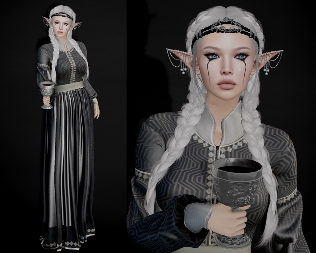 You’re dying to know where to get those neat viking outfits, right? They’re both from R3D Studio, which is completely new store to me. My best friend, who is from Denmark, is a viking-enthusiast, and she was telling me how the tunic looks like what the vikings actually wore back in the day. Both outfits come in various colours, and the boots are sold separately. The tunic Ilyan’s wearing comes with clean and bloody version, and it’s also available for women. My headband is from Bliensen + MaiTai. They got also a matching necklace, but I couldn’t fit it nicely with the collar of the dress. The goblet of wine is made by Old Treasures. It comes with hold animation and is available in brass, iron and copper. Lastly, Ilyan’s axe is from Forge. I’m wearing the cosmetic version, but it’s also available with combat scripts.