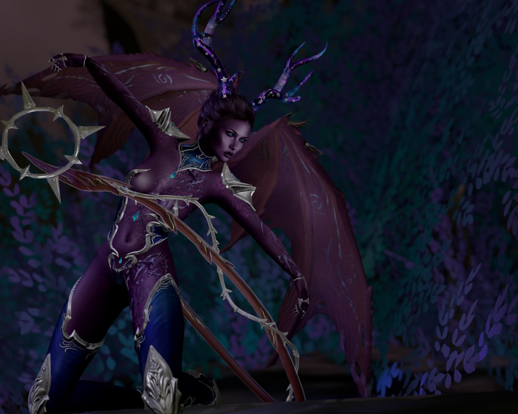A sudden flick of movement from the right caught my attention, and then I saw her. Purple skin, horns, wings and a tail – she must be a demon! I quickly retreated behind the shrubs. I don’t think she noticed me, because when I peeked out, she was still there just stretching her body.
