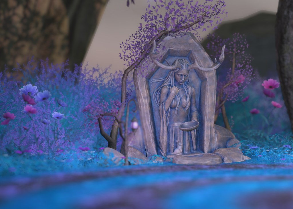 Today I visited Wandering Woods. Ilyan had gone home already, so I was alone again. The canopy in this beautiful sim is so thick, it was rather dark, but I felt at peace, at least until I came to the huge guardian statue at the center of the area.