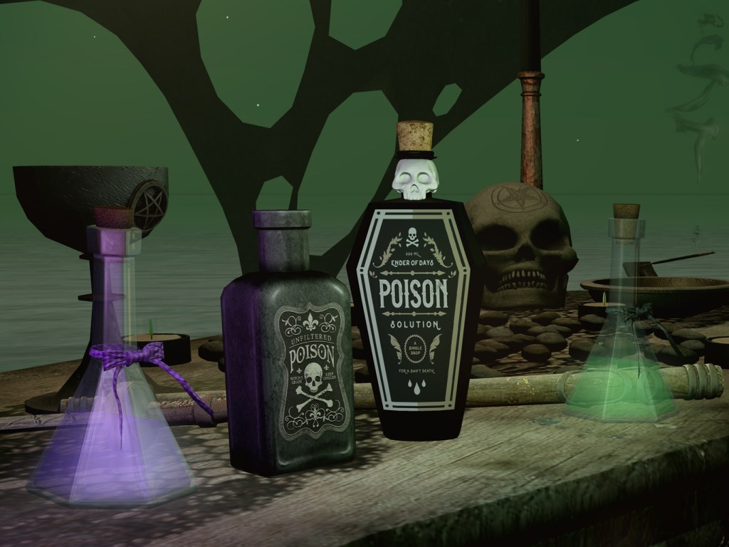 The poison bottles in my scene are holdables, but since I could only wear one bottle, I rezzed the other two into the scene.