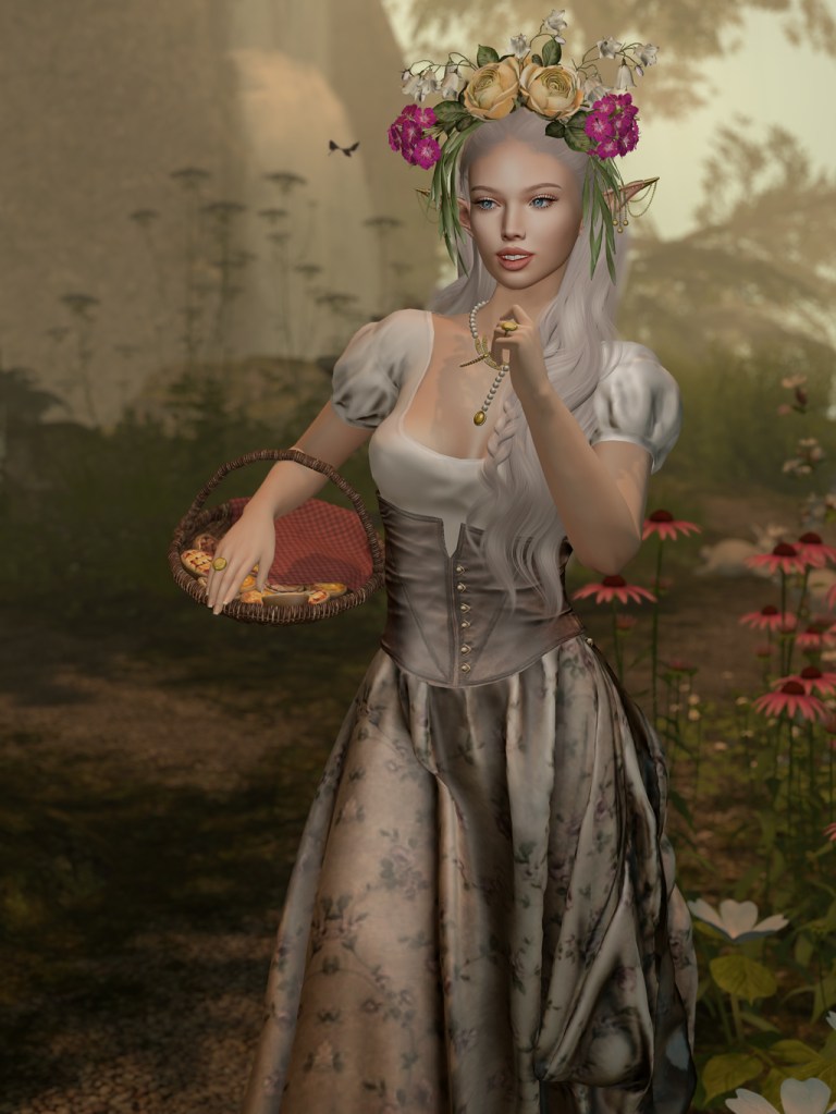 So, let’s get to what I’m wearing. My beautiful dress is from UNA. It’s also available in other colours. The basket with tartlets is from Lorien. It comes with this nifty hold pose and they also have a basket with veggies. Both of these items you can find from the current found of We ❤ RP. The rest of the items are not new, I just took a dive to my inventory to see what I might have that works with the look.