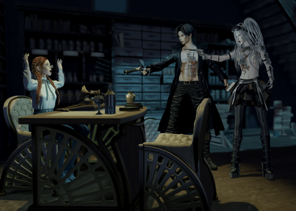 I got the idea for the pic when I saw these two guns and the office set at the Engine Room event. Of course, they’re not the only items I found from there, and we’re wearing quite a few other items from the event in this post, too. I have to admit I found so much cool stuff, that I couldn’t fit them all in this one post, so I’ll need to make one, maybe two, more posts later. Anyway, if you like steampunk, this is THE event to go. π