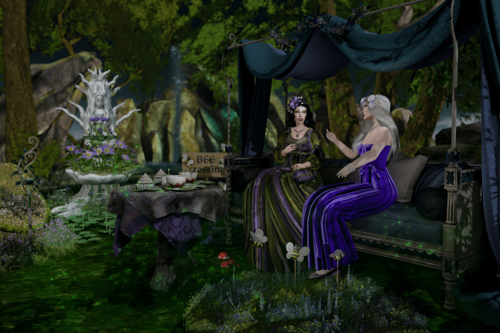 Then there’s the decoration. The fancy bench/lounger is from Tirrany Designs and it comes with matching lamps. The cute teaset at the table is from Bloom!. The supercute bees and ladybugs are from Simply Shelby and they come with flower patches, too. Simply Shelby has also a butterfly topiary in the Faire, which didn’t fit completely to my pic. The beautiful statue/planter is from Bloom!
