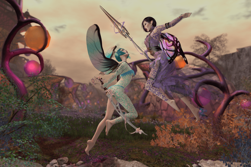 Today we decided to make fairy looks, cause there’s just so many items which fit for fairies. There’s also a lot of cool weapons in the Faire, so I figured to make an aerial battle pic to show off some of them.
